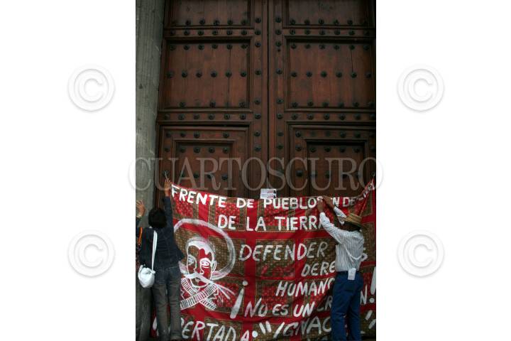 MÉXICO, D.F. 04MAYO2007.- Habitantes de San Salvador Atenco, acompañados de simpatizantes, marcharon a un año del encarcelamiento de los presos políticos, a su llegada al Zócalo capitalino colocaron una pancarta en las puertas de Palacio Nacional. FOTO: PAOLA HIDALGO/CUARTOSCURO.COM