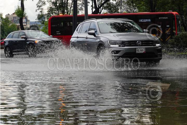 CIUDAD DE MÉXICO, 02SEPTIEMBRE2025.- Tras las intensas lluvias que comenzaron desde las cinco de la mañana, zonas como Circuito Interior, esquina con Marina Nacional, amanecieron severamente encharcadas, lo que provocó un intenso tráfico vehicular. En la imagen varios autos atraviesan uno de los charcos generados. FOTO: MOISÉS PABLO/CUARTOSCURO.COM