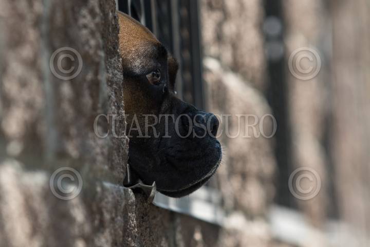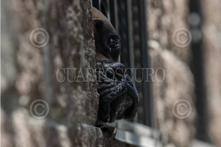 Un perro de la raza Boxer mira nostálgico la calle, desde la ventana de su casa, en la alcaldía Cuauhtémoc.