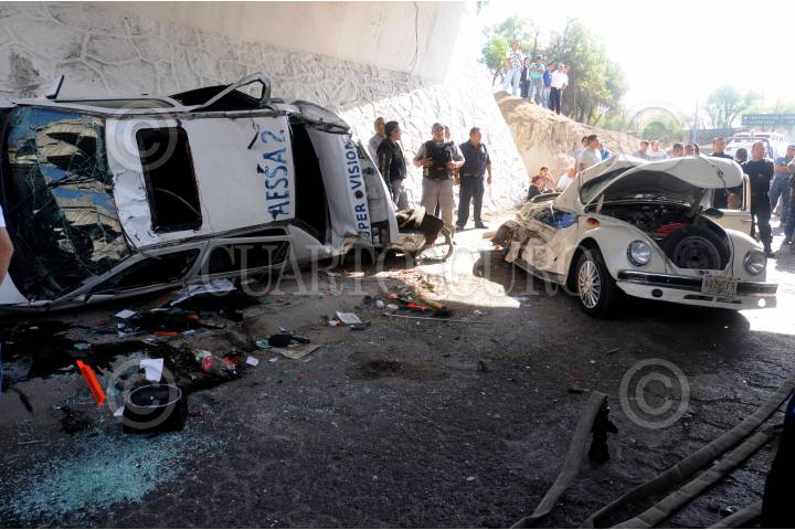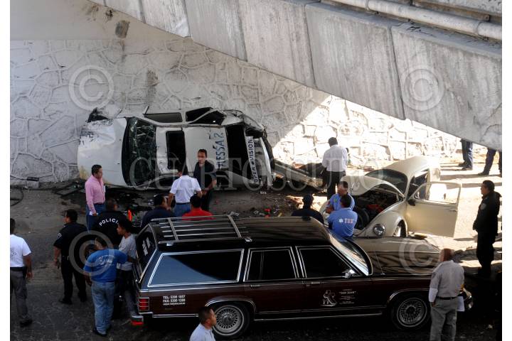MÉXICO, D.F., 05ABRIL2009.- Un sujeto perdió la vida abordo de su auto VW blanco con placas de circulación 602-UFR al caerle encima otro auto tipo Jetta de seguridad privada con número económico AESSA2, el cuál circulaba con exceso de velocidad sobre el puente de periférico a la altura de la calle constelación, de la colonia jardines de la Hacienda en cuautitlan Izcalli. FOTO: LUIS CARBAYO/CUARTOSCURO.COM