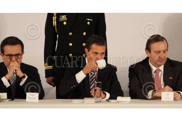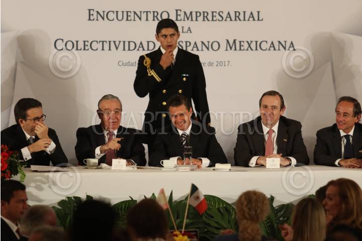 CIUDAD DE MÉXICO, 20OCTUBRE2017.- Enrique Peña Nieto, presidente de México, acompañado de Valentín Diez Morodo, presidente del Consejo Empresarial Mexicano del Comercio Exterior, Inversión y Tecnología Idelfonso Guajardo Villareal Secretario de Economia y el embajador de España, Luis Fernández-Cid de las Alas Pumariño, durante el encuentro empresarial de la colectividad mexicana realizado en la Hacienda de los Morales. FOTO: SAÚL LÓPEZ /CUARTOSCURO.COM