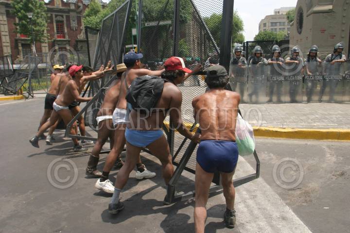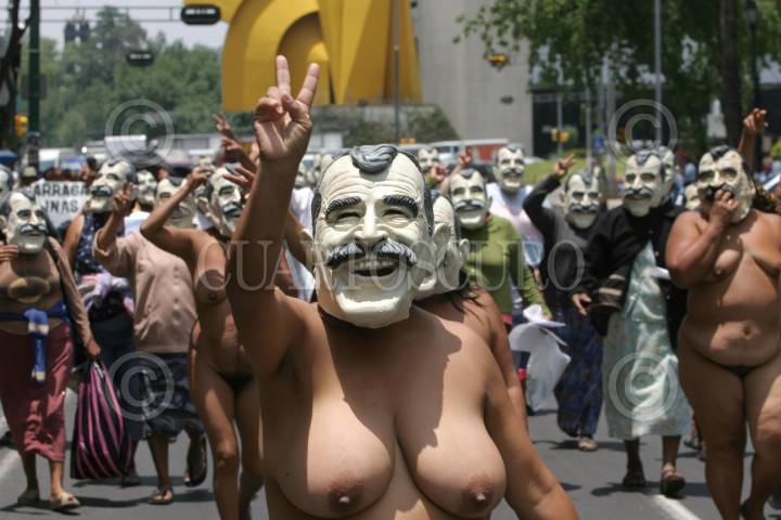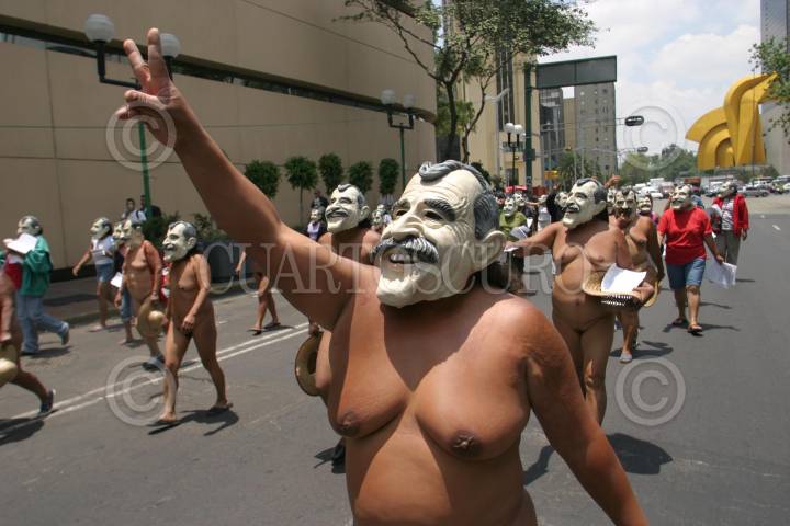 MEXICO, D.f., 16MAYO2006.- La organización campesina de los 400 Pueblos, marcharon del Monumento de Cuauhtemoc a la Secretaría de Gobernación, exigiendo se cumplan los acuerdos que supuestamente firmaron con el gobierno. Los manifestantes que se caracterizan por ir desnudas estaban iban enmascaradas del Presidente de la República. FOTO: Moisés Pablo/CUARTOSCURO.COM