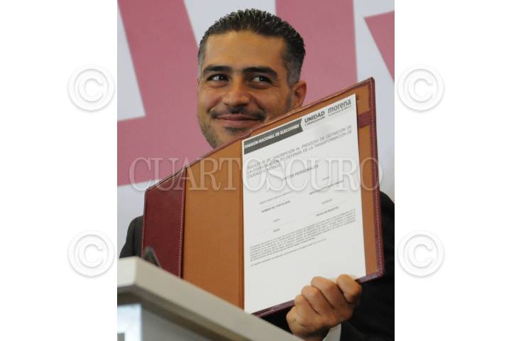 CIUDAD DE MÉXICO, 25SEPTIEMBRE2023. - Omar García Harfuch, ex secretario de Seguridad capitalina, muestra su hoja de registro como aspirante a coordinador de los Comités de Defensa de la 4T en la Ciudad de México. FOTO: DANIEL AUGUSTO /CUARTOSCURO.COM