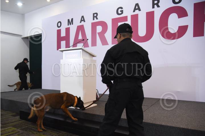 CIUDAD DE MÉXICO, 25SEPTIEMBRE2023.- Dos binomios caninos inspeccionan el lugar donde será la conferencia de Omar García Harfuch. FOTO: DANIEL AUGUSTO/ CUARTOSCURO.COM