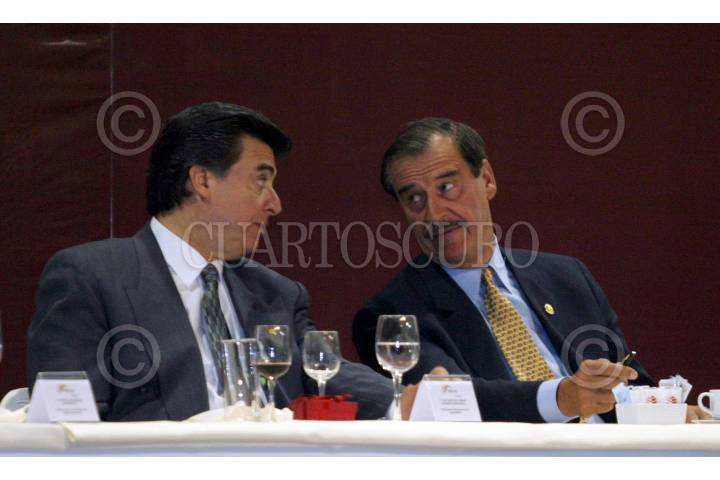 México, D. F. 28 Abril 2004.- Hétor Aguirre, presidente nacional de la camara de la industria de desarrollo y promoción de vivienda conversa con el presidente Vicente Fox durante la clausura del XVIII encuetro internacional de vivienda. FOTO: Nelly Salas/CUARTOSCURO.COM
