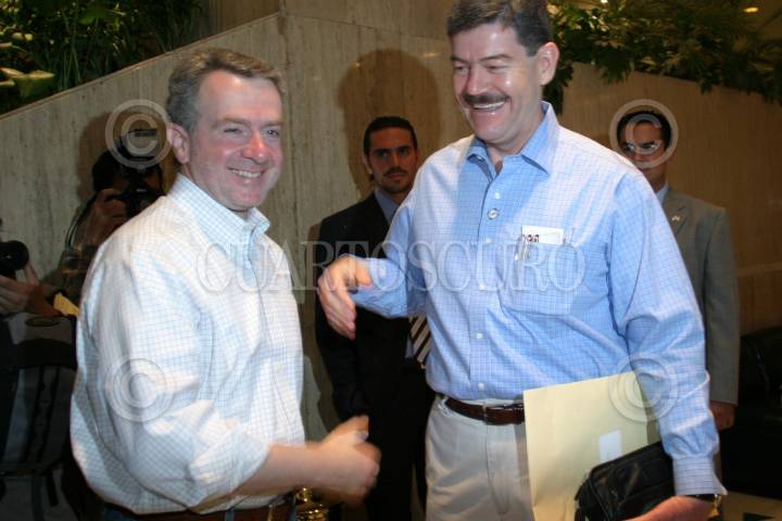 México, D. F. 29 Mayo 2004.- Santiago Creel, secretario del gobernación y Francisco Barrio, coordinador de la fracción parlamentaria del PAN en la cámara de diputados se saludan al llegar al encuetro interestatal de jóvenes panistas. FOTO: Nelly Salas/CUARTOSCURO.COM