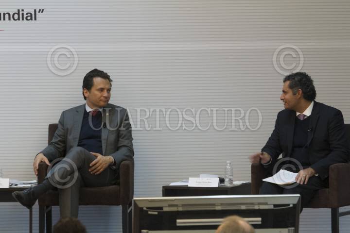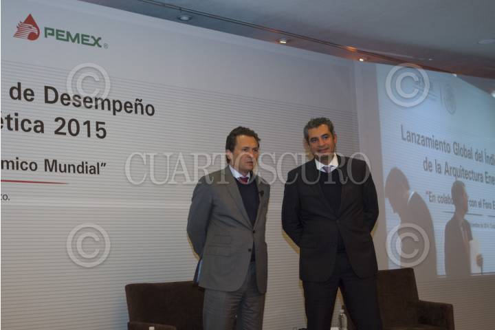 MÉXICO, D.F., 10DICIEMBRE2014.- Emilio Lozoya Austin, Director General de Petróleos Mexicanos, Enrique Ochoa Reza, Director Federal de Electricidad, durante la presentación del Lanzamiento Global del Índice de Desempeño de la Arquitectura Energética 2015, en las instalaciones de la Secretaria de Relaciones Exteriores. FOTO: GUILLERMO PEREA /CUARTOSCURO.COM