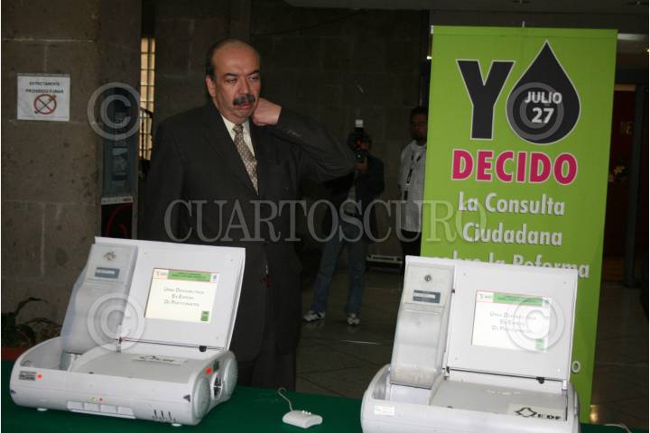 MÉXICO. D.F.22JULIO2008.- Jose Angel Avila secretario de gobierno del D.F., presentó las urnas electrónicas que se usaran en algunos puntos el próximo 27 de julio el día de la consulta ciudadana sobre la reforma energética. FOTO:RICARDO CASTELAN/CUARTOSCURO.COM