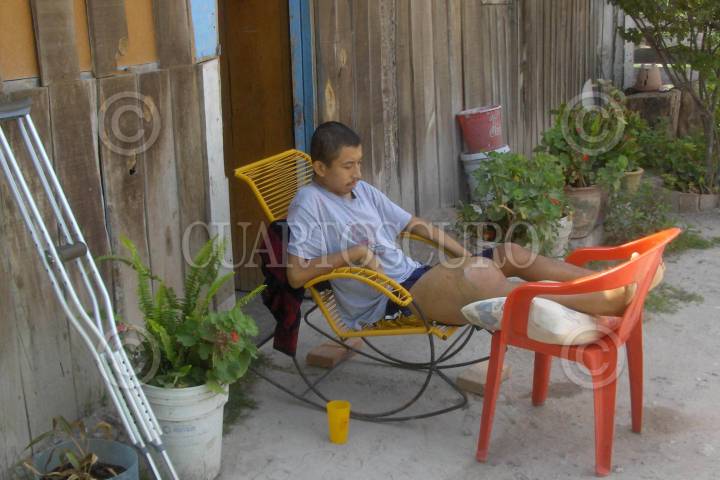 CHILPANCINGO, GUERRERO 15JUNIO2006.- El joven Jesus Navarrete Salgado de 20 años de edad, quien presenta un tumor cancerigeno en su pierna derecha, reposa afuera de su domicilio ubicado en la colonia San Rafael Oriente de la ciudad. Denunciando que no ha recibido ayuda alguna por parte de las autoridades de salud, tanto municipal como estatal, para recibir un tratamiento para su enfermedad, ya que su familia es de escasos recursos economicos. FOTO: Oscar Alvarado/CUARTOSCURO.COM