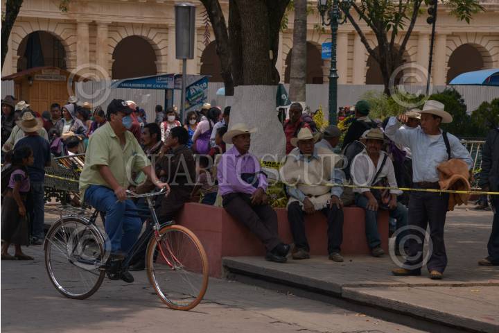 Un hombre con cubre bocas pasea en bicicleta por el centro de la ciudad durante la contingencia por COVID 19.