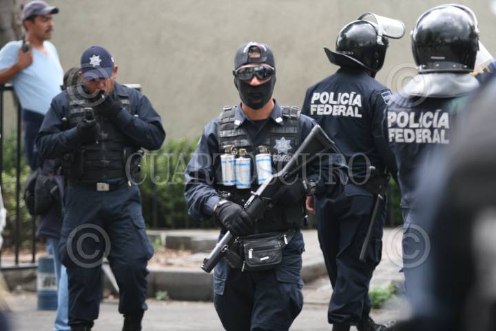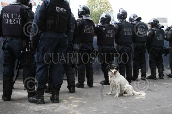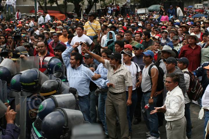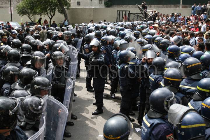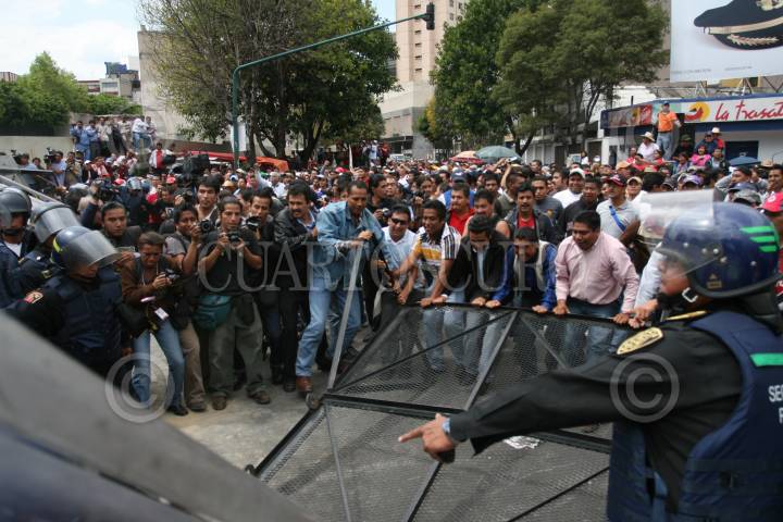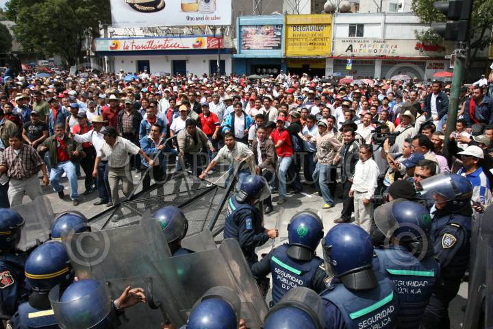 MÉXICO D.F., 08OCTUBRE2008.-Maestros integrantes de la CNTE, protestaron a las afueras de la Secretaría de Gobernación, a la cual intentaron entrar enfrentándose y aventado las vayas metálicas colocada por los elemento de la Secretaria de Seguridad que resguardan estas instalaciones. FOTO: GUILLERMO PEREA/CUARTOSCURO.COM