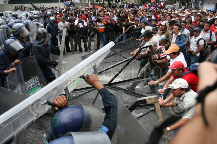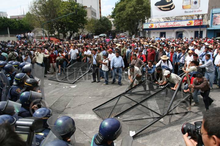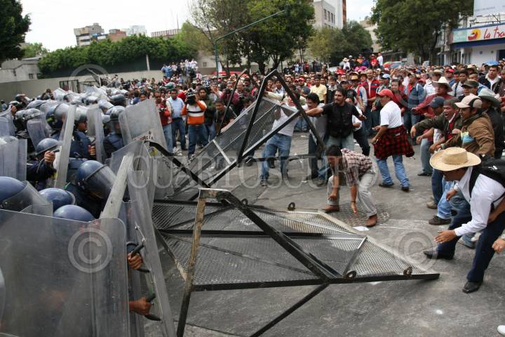 MÉXICO D.F., 08OCTUBRE2008.-Maestros integrantes de la CNTE, protestaron a las afueras de la Secretaría de Gobernación, a la cual intentaron entrar enfrentándose y aventado las vayas metálicas colocada por los elemento de la secretaria de Seguridad que resguardan estas instalaciones. FOTO: GUILLERMO PEREA/CUARTOSCURO.COM