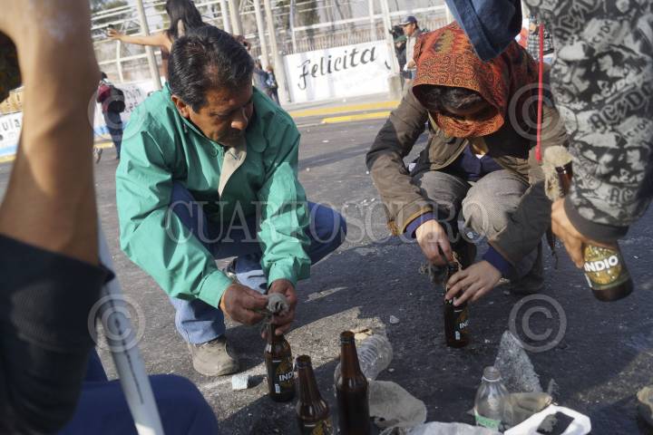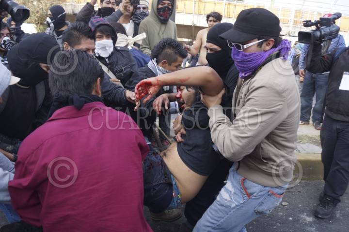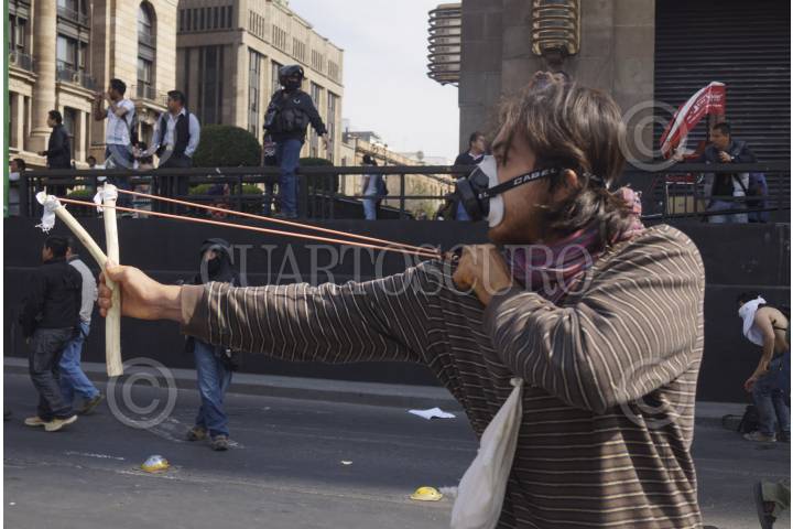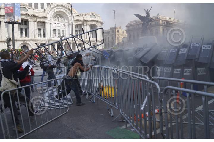 MÉXICO, D.F., 01DICIEMBRE2012.- Enfrentamiento entre protestantes en contra del presidente Enrique Peña Nieto, y la policía, que empezó a las afueras de la cámara de diputados, para luego pausar el combate y continuar sobre Eje Central a la altura del Palacio de Bellas Artes. Los manifestantes fueron replegados por avenida Juárez hasta ser dispersados sobre Paseo de la Reforma, destruyendo todo a su paso para defenderse de la policía. Un joven recibió un impacto con un arma por parte de la policía, el joven perdió un ojo. FOTO: PEDRO ANZA / CUARTOSCURO.COM