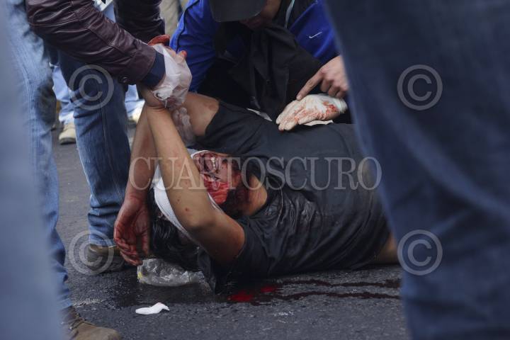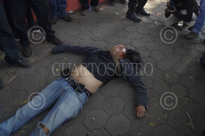 MÉXICO, D.F., 01DICIEMBRE2012.- Enfrentamiento entre protestantes en contra del presidente Enrique Peña Nieto, y la policía, que empezó a las afueras de cámara de diputados, para luego pausar el combate y continuar sobre Eje Central a la altura del Palacio de Bellas Artes. Los manifestantes fueron replegados por avenida Juárez hasta ser dispersados sobre Paseo de la Reforma, destruyendo todo a su paso para defenderse de la policía. Un hombre recibió un impacto con un arma por parte de la policía. FOTO: PEDRO ANZA / CUARTOSCURO.COM