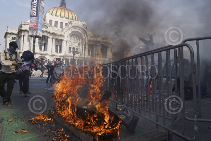 MÉXICO, D.F., 01DICIEMBRE2012.- Enfrentamiento entre manifestantes en contra del presidente Enrique Peña Nieto, y la policía, que empezó a las afueras de la cámara de diputados, para luego pausar el combate y continuar sobre Eje Central a la altura del Palacio de Bellas Artes. Los manifestantes fueron replegados por avenida Juárez hasta ser dispersados sobre Paseo de la Reforma, destruyendo todo a su paso para defenderse de la policía. . FOTO: PEDRO ANZA / CUARTOSCURO.COM