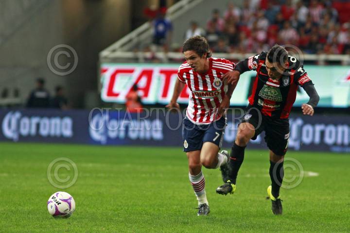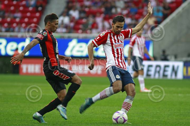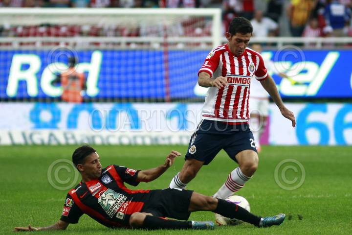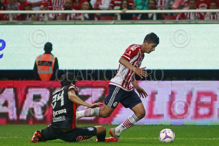 ZAPOPAN, JALISCO. 01NOVIEMBRE2015.- El jugador del Chivas Ángel Zaldívar, disputa un balón frente al contrario del Pachuca, Miguel Equihua, esto en partido correspondiente a la Jornada 15 del Torneo Apertura 2015 de la Liga MX, en donde se enfrentaron los equipos de las Chivas de Guadalajara frente a Tuzos del Pachuca, en partido que se llevo a cabo en el Estadio Omnilife y en donde el marcador final fue de 4-4. FOTO: FERNANDO CARRANZA GARCIA / CUARTOSCURO.COM