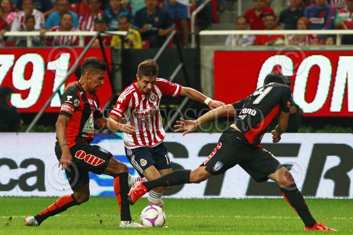 ZAPOPAN, JALISCO. 01NOVIEMBRE2015.- El jugador del Chivas Isaac Brizuela, disputa un balón frente a los contrarios del Pachuca, esto en partido correspondiente a la Jornada 15 del Torneo Apertura 2015 de la Liga MX, en donde se enfrentaron los equipos de las Chivas de Guadalajara frente a Tuzos del Pachuca, en partido que se llevo a cabo en el Estadio Omnilife y en donde el marcador final fue de 4-4. FOTO: FERNANDO CARRANZA GARCIA / CUARTOSCURO.COM