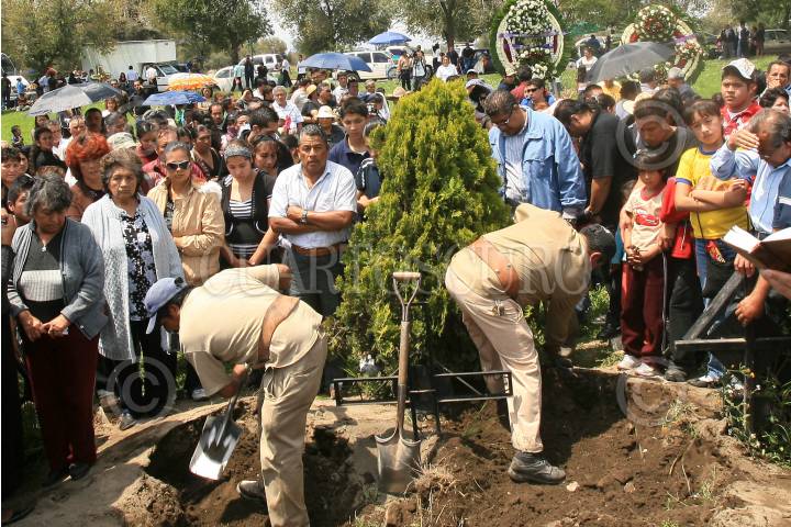 ECATEPEC, ESTADO DE MÉXICO 17JULIO2009.- Este viernes policías municipales dieron el último adiós a su compañero, Rafael Díaz Arroyo, quien tenía siete años en la corporación y en cuatro ocasiones fue reconocido por el Ayuntamiento por tener el mayor número de detenciones entre los mandos. Díaz Arroyo se enfrentó a disparos con un delincuente que asaltó una combi que se dirigía a Indios Verdes con 12 pasajeros, a la altura de Santa María Tulpetlac; el sujeto sacó una pistola y durante un forcejeo tanto el ladrón como el jefe policiaco murieron. FOTO: MARIO NULO/CUARTOSCURO.COM