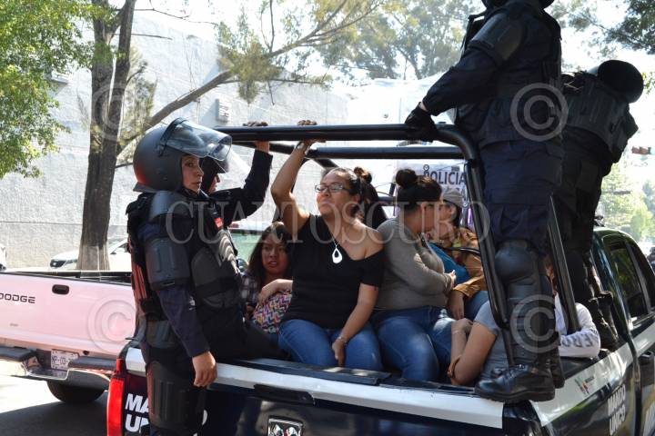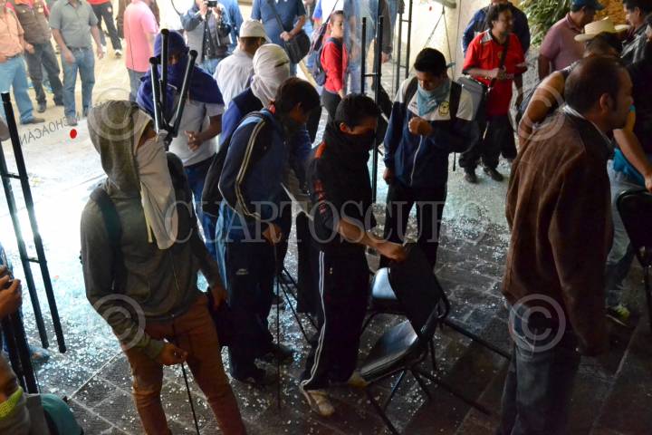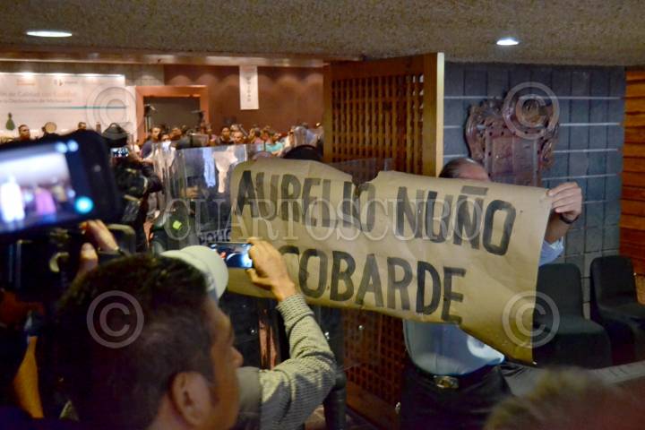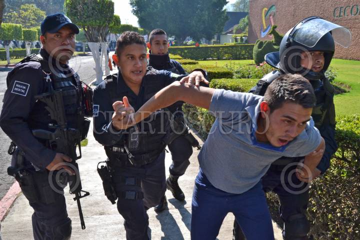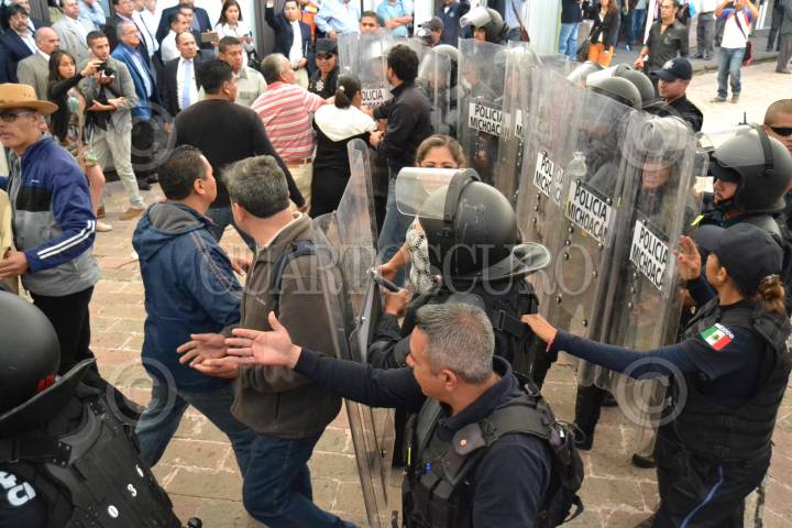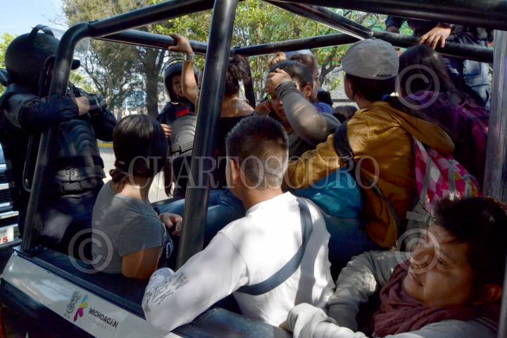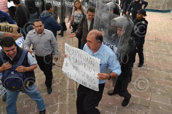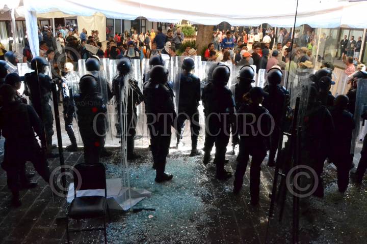 MORELIA, MICHOACÁN, 27ABRIL2016.- Durante la visita de Aurelio Nuño, secretario de Educación Pública, maestros de la sección 18 de la Coordinadora Nacional de Trabajadores de la Educación (CNTE) se enfrentaron con policías antimotines en el Centro de Convenciones y Exposiciones (Ceconexpo), los inconforme que calificaron la visita de ser una provocación lanzaron piedras y rompieron vidrios, 44 personas fueron detenidos, entre normalistas y maestros. FOTO: HÉCTOR SÁNCHEZ /CAMBIO DE MICHOACÁN/CUARTOSCURO.COM
