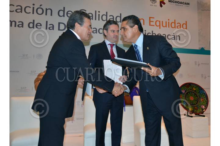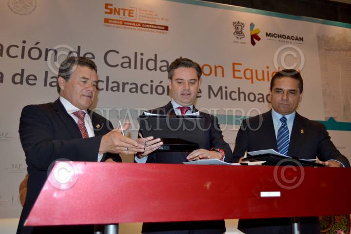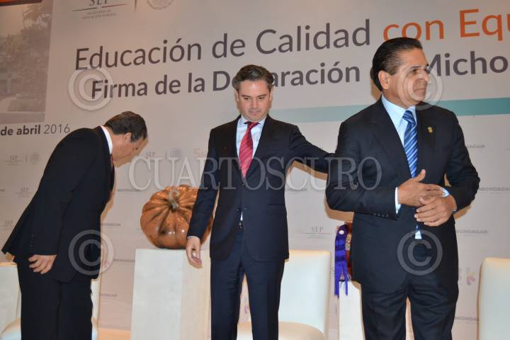 MORELIA, MICHOACÁN, 27ABRIL2016.- Durante la visita de Aurelio Nuño, secretario de Educación Pública, maestros de la sección 18 de la Coordinadora Nacional de Trabajadores de la Educación (CNTE) se enfrentaron con policías antimotines en el Centro de Convenciones y Exposiciones (Ceconexpo), los inconforme que calificaron la visita de ser una provocación lanzaron piedras y rompieron vidrios, 44 personas fueron detenidos, entre normalistas y maestros. En la imagen Juan Díaz de la Torre, líder del SNTE, Aurelio Nuño, titular de la SEP, y Silvano Aureoles Conejo, gobernador de la entidad, durante la firmaron el acuerdo "Educación de Calidad con Equidad. FOTO: HÉCTOR SÁNCHEZ /CAMBIO DE MICHOACÁN/CUARTOSCURO.COM