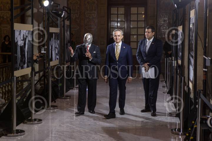 CIUDAD DE MÉXICO, 27JULIO2017.- El Hijo del Santo, Miguel Ángel Mancera Espinosa, jefe de gobierno, y José Ramón Amieva, secretario de Desarrollo Social, durante un acto protocolario de celebración de los 100 años del natalicio de "Santo, el enmascarado de plata". FOTO: TERCERO DÍAZ /CUARTOSCURO.COM