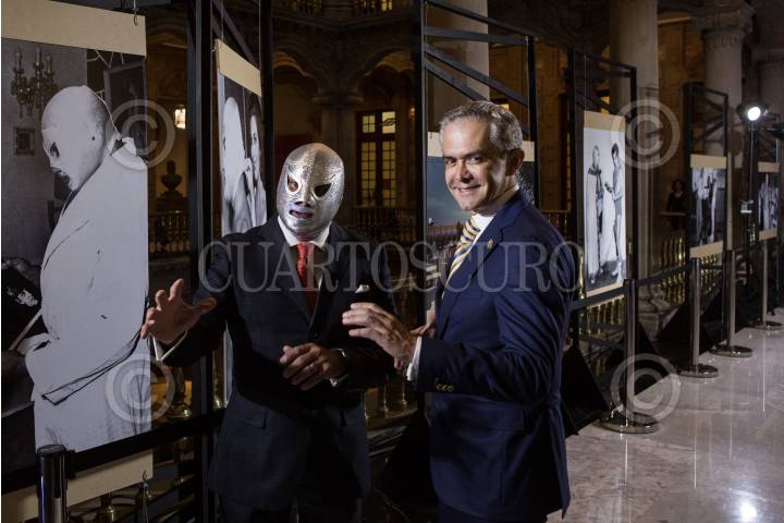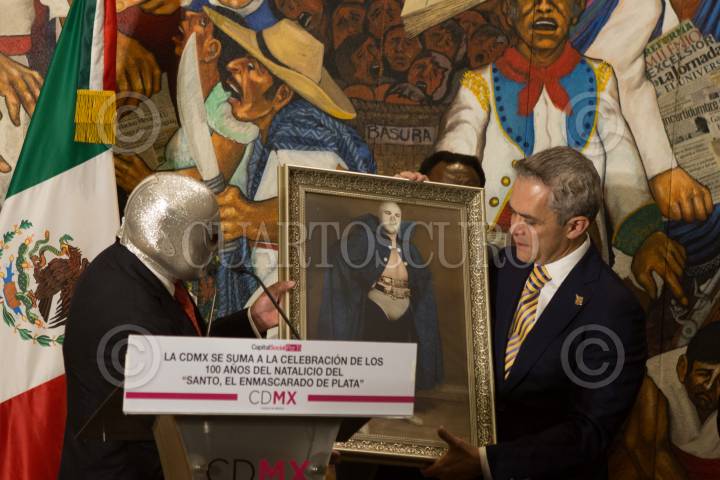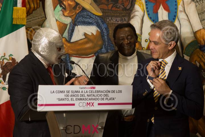CIUDAD DE MÉXICO, 27JULIO2017.- El Hijo del Santo, Miguel Ángel Mancera Espinosa, y jefe de gobierno, durante un acto protocolario de celebración de los 100 años del natalicio de "Santo, el enmascarado de plata". FOTO: TERCERO DÍAZ /CUARTOSCURO.COM