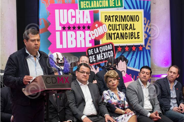 CIUDAD DE MÉXICO, 21JULIO2018.- José Ramón Amieva, jefe de Gobierno de la Ciudad, encabezó la firma y presentación del Decreto de la Declaratoria de la Lucha Libre Mexicana como Patrimonio Intangible de la Ciudad de México. Al evento también asistieron Héctor Serrano, secretario de Movilidad, Eduardo Vázquez Martín, secretario de cultura, Armado López Cardenas, secretario de turismo, Eva Angélica Sánchez, sub coordinadora, Antonio Peña Herrada, promotor de la lucha libre en mexico, Marisela Peña, presidenta de la lucha libre AAA; así como los luchadores la parca, vampiro canadiense, acertijo y el hijo del fantasma. FOTO: ANDREA MURCIA /CUARTOSCURO.COM