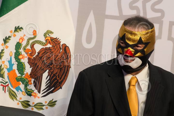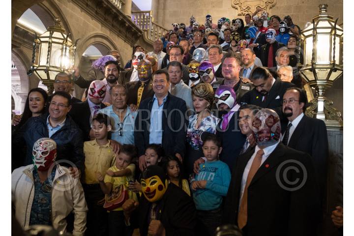 CIUDAD DE MÉXICO, 21JULIO2018.- José Ramón Amieva, jefe de Gobierno de la Ciudad, encabezó la firma y presentación del Decreto de la Declaratoria de la Lucha Libre Mexicana como Patrimonio Intangile de la Ciudad de México. Al evento también asistieron Héctor Serrano, secretario de Movilidad, Eduardo Vázquez Martín, secretario de cultura, Armado López Cardenas, secretario de turismo, Eva Angélica Sánchez, sub coordinadora, Antonio Peña Herrada, promotor de la lucha libre en mexico, Marisela Peña, presidenta de la lucha libre AAA; así como los luchadores la parca, vampiro canadiense, acertijo y el hijo del fantasma. FOTO: ANDREA MURCIA /CUARTOSCURO.COM