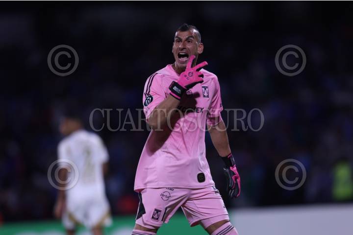 CIUDAD DE MÉXICO, 01MAYO2025. El portero de Tigres, Nahuel Guzmán reclama durante el partido de fútbol Cruz Azul vs Tigres correspondiente a la vuelta de la semifinal de la Copa de Campeones de la Concacaf, en el Estadio Olímpico Universitario. FOTO: EDGAR NEGRETE LIRA/CUARTOSCURO.COM