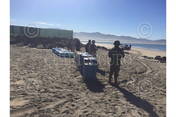 ENSENADA, BAJA CALIFORNIA, 17ENERO2019.- La Secretaría de Marina-Armada de México, en funciones de Policía Naval en acciones de apoyo a la seguridad pública a través de la Segunda Región Naval, con sede en Ensenada, Baja California, en coordinación con personal de la Secretaría de la Defensa Nacional y Policía Federal; informa que, ayer se aseguraron 26 paquetes que en su interior contenían un producto con características similares a la marihuana, con un peso aproximado de 560 kilogramos; además de mil 460 litros de combustible distribuidos en 10 bidones, en inmediaciones de la playa “Estero Beach” de citado puerto. Esta acción se realizó durante un recorrido de vigilancia, donde avistaron una embarcación menor abandonada con paquetes azules y bidones con combustible en la playa de “Estero Beach”, lo anterior en el marco del Plan Nacional de Paz y Seguridad 2018-2024 del Gobierno de México. La presunta droga asegurada y el material localizado, fueron puestos a disposición ante el Agente del Ministerio Público Federal de Ensenada, Baja California, para llevar a cabo las pruebas correspondientes, la determinación del peso ministerial y la integración de la carpeta de investigación. FOTO: SEMAR /CUARTOSCURO.COM
