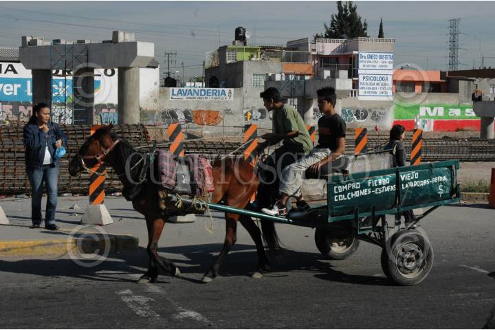 ECATEPEC, EDO. DE MÉXICO, 27MAYO2009.- Jóvenes carretoneros que compran fierro viejo y enseres domésticos usados circulan sobre Avenida Central, esquina con avenida Primero de Mayo. FOTO: MARIO NULO/CUARTOCURO.COM
