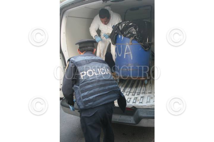 MÉXICO, D.F., 09NOVIEMBRE2009.- El cuerpo sin vida de un sujeto, del cual se desconoce edad aproximada, fue abandonado en un tambo de plástico color azul y envuelto en lonas frente al número 8 de la calle Cieneguillas, sobre el arroyo vehicular, entre las calles Talabarteros y Plomeros, de la colonia Ampliación Michoacana, perímetro de la Delegación Venustiano Carranza. Al lugar arribaron peritos de esta demarcación para el levantamiento del cuerpo y trasladarlo al anfiteatro correspondiente. FOTO: LUIS CARBAYO/CUARTOSCURO.COM