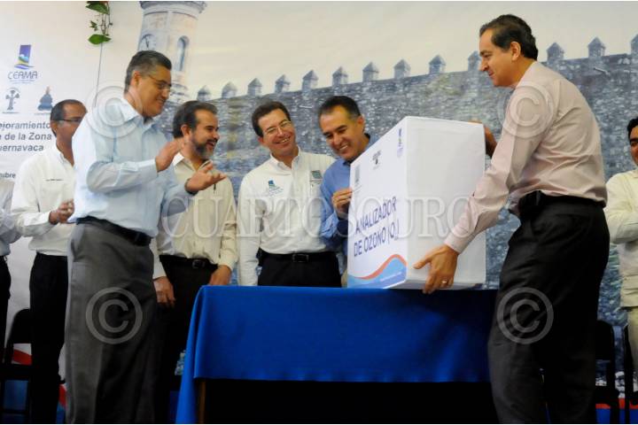 CUERNAVACA, MORELOS, 21OCTUBRE2009.- Juan Rafael Elvira Quesada, Secretario del Medio Ambiente junto a Marco Adame, gobernador de la entidad durante la entrega de un equipo analizador de ozono a la UAEM. En el lugar también presentaron una firma del convenio PROAIRE para mejorar la calidad del aire en la entidad. FOTO: XIMENA DE LA SERNA/CUARTOSCURO.COM