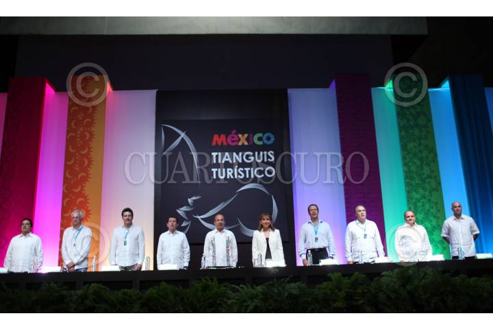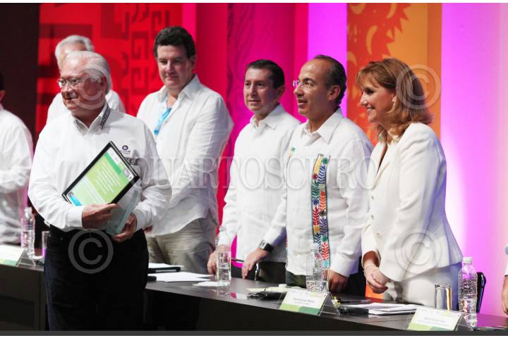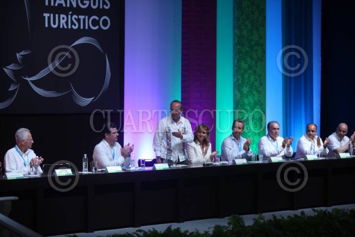 ACAPULCO, GUERRERO, 25MARZO2011.- El presidente Felipe Calderón acompañado de Zeferino Torreblanca, gobernador del estado y de Gloria Guevara, secretaria de Turismo durante la inauguración del 36 Tianguis Turistico 2011 que se realizo en esta entidad. FOTO: ALFREDO GUERRERO/CUARTOSCURO.COM