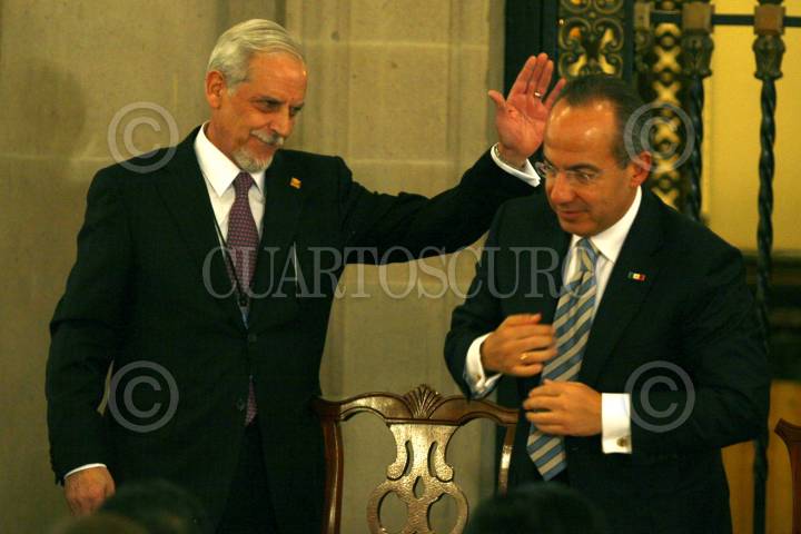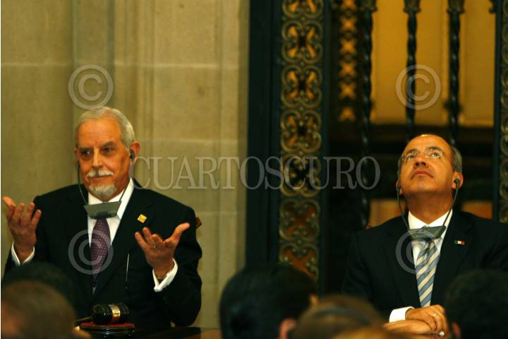 MÉXICO, D.F. 05NOVIEMBRE2007.- El presidente Felipe Calderón Hinojosa inauguró los trabajos del XIX Congreso de la INTOSAI. En la imagen con Arturo González Aragón, presidente entrante del comité directivo de la INTOSAI. FOTO: PAOLA HIDALGO/CUARTOSCURO.COM