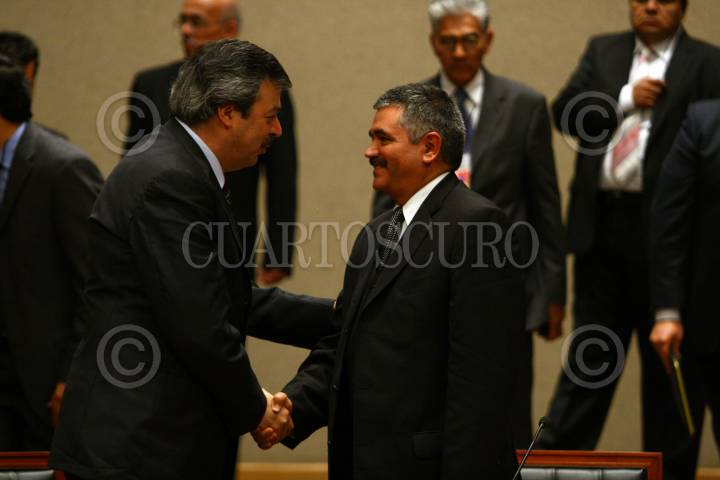 MÉXICO,D,F 08FEBRERO2008.- Andres Albo quien fungio como consejero presidente provisional felicita a Leonardo Zurita Valdes consejero presidente entrante del Instituto Federal Electoral. FOTO: SASHENKA GUTIERREZ/CUARTOSCURO.COM