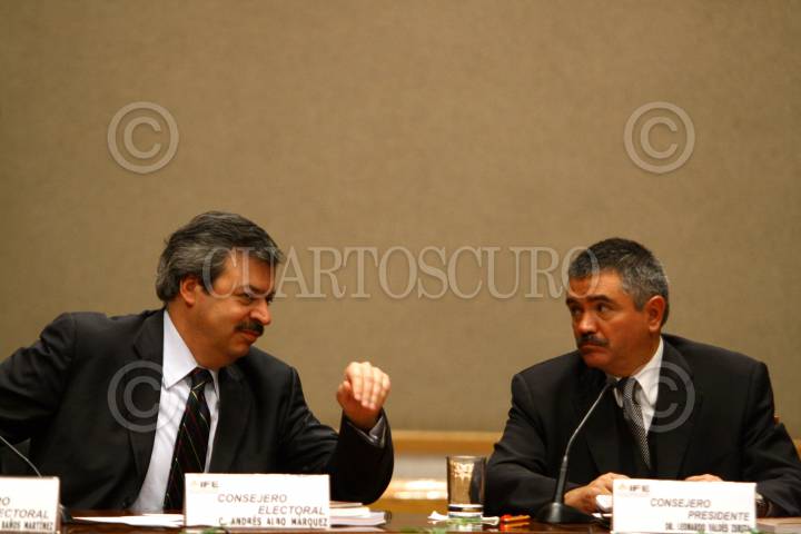 MÉXICO,D,F 08FEBRERO2008.- Andres Albo quien fungio como consejero presidente provisional platica con Leonardo Zurita Valdes consejero presidente entrante del Instituto Federal Electoral. FOTO: SASHENKA GUTIERREZ/CUARTOSCURO.COM