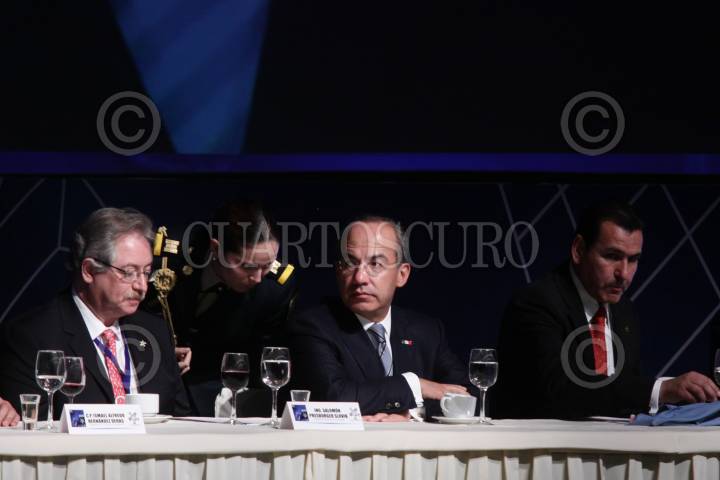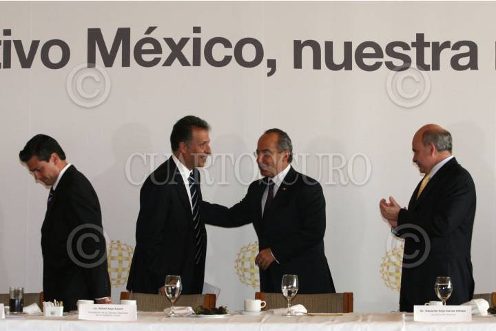 MÉXICO D.F. 10MARZO2008.-El presidente, Felipe Calderón Hinojosa, acudio a la comida de Clausura de los trabajos de la LXXI Asamblea General Ordinaria de la Cámara Nacional de la Industria Textil.En la imagen es acompañado por Enrique Peña Nieto, Gobernador del Estado de México, Rafael Zaga Calach presidente saliente de la cámara, Davida García Cosio presiednte entrante de la cámara y Eduardo Sojo, titular de la Secretaría de Economia. FOTO: GUILLERMO PEREA/CUARTOSCURO.COM