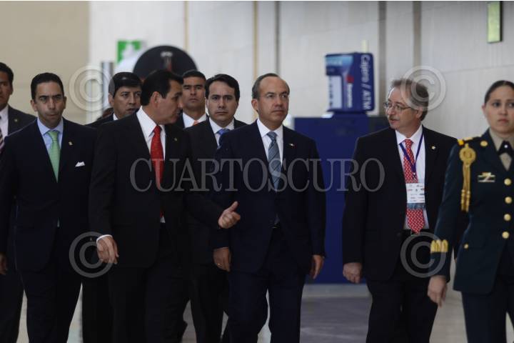 MÉXICO, D.F., 23MARZO2009.- Ismael Plascencia Nuñez Presidente Saliente de la confederación de Cámaras Industriales de los Estados Unidos Mexicanos, Felipe Calderón Hinojosa Presidente de México, Salomón Presburguer Presidente entrante de la CONCAMIN a su llegada al centro de exposiciones Banamex, donde se realizó la 91 asamblea general ordinaria de la (CONCAMIN). FOTO: SÁSHENKA GUTIERREZ/CUARTOSCURO.COM