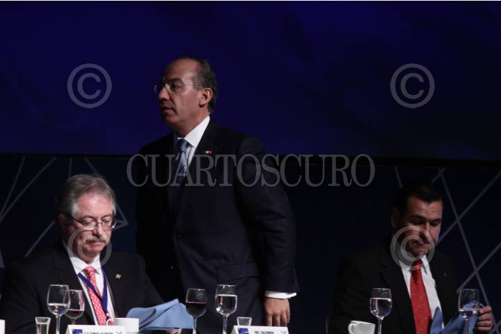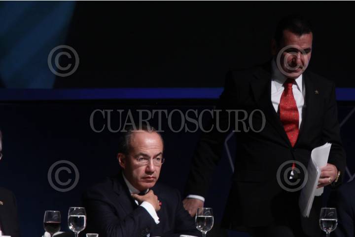 MÉXICO, D.F., 23MARZO2009.- Felipe Calderón Presidente de México, Ismael Plascencia Nuñez Presidente Saliente de la confederación de Cámaras Industriales durante la 91 asamblea general ordinaria de la (CONCAMIN), donde Felipe Calderón presidente de México realizó la toma de protesta de la nueva mesa directiva. FOTO: SÁSHENKA GUTIERREZ/CUARTOSCURO.COM