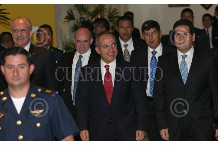 MÉXICO D.F. 10MARZO2008.-El presidente, Felipe Calderón Hinojosa, acudio a la comida de Clausura de los trabajos de la LXXI Asamblea General Ordinaria de la Cámara Nacional de la Industria Textil.En la imagen es acompañado por Enrique Peña Nieto, Gobernador del Estado de México, Rafael Zaga Calach presidente saliente de la cámara y Eduardo Sojo, titular de la Secretaría de Economia. FOTO: GUILLERMO PEREA/CUARTOSCURO.COM