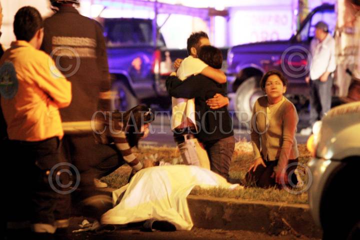 NEZAHUALCOYOTL, ESTADO DE MÉXICO, 20MAYO2011.- Dos personas muertas y dos lesionados es el saldo de un choque multiple sobre la av. Central a la altura de la estación del metro Impulsora. Según los estudios periciales un vehículo color gris volcó después de chocar contra un árbol y los automovilistas que vieron el accidente se bajaron a ayudar, durante la labor de rescate otros tres vehículos se impactaron entre sí. FOTO: LM ACEVEDO/CUARTOSCURO.COM
