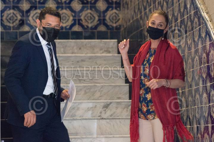 Claudia Sheinbaum Pardo, jefa de Gobierno, y Martí Batres, secretario de Gobierno capitalino, previo a la entrega de Reconocimientos a Representantes de Carnavales y Comparsas en la Ciudad de México.
