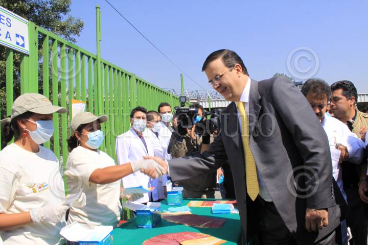 MÉXICO D.F., 25ABRIL2009.- El jefe de Gobierno Marcelo Ebrard, superviso los módulos que se encuentran ubicados en la central camionera de Taxqueña como apoyo que el gobierno capitalino brinda a la población donde se entregan cubrebocas a los capitalinos en la Central de Autobuses del Sur FOTO: SÁSHENKA GUTIÉRREZ/CUARTOSCURO.COM