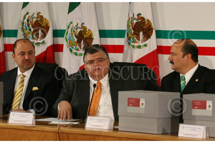 MÉXICO D.F., 08SEPTIEMBRE2008.-Agustín Cartens Cartens, titular de la Secretaría de Hacienda y Crédito Público acudió este medio día a la Cámara de Diputados a entregar la propuesta del paquete Económico para 2009. En la imagen el titular es acompñado de los diputados, Raúl Alejandro Padilla, presidente de la comisión de Presupuesto y Cuenta Pública y el presidente de la mesa directiva, Cesar Duarte Jáquez. FOTO: GUILLERMO PEREA/CUARTOSCURO.COM