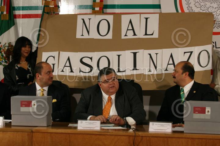 MÉXICO D.F., 08SEPTIEMBRE2008.-Agustín Cartens Cartens, titular de la Secretaría de Hacienda y Crédito Público acudió este medio día a la Cámara de Diputados a entregar la propuesta del paquete Económico para 2009. En la imagen los diputados del PRD, Claudia Cruz y Alejandro Sanchez, muestran una cartel a las espaldas del titular de hacienda con la leyenda "No Al Gasolinazo". FOTO: GUILLERMO PEREA/CUARTOSCURO.COM