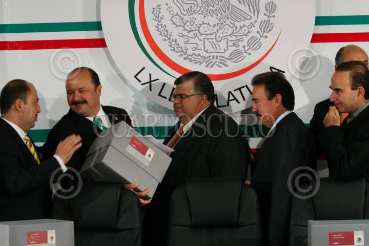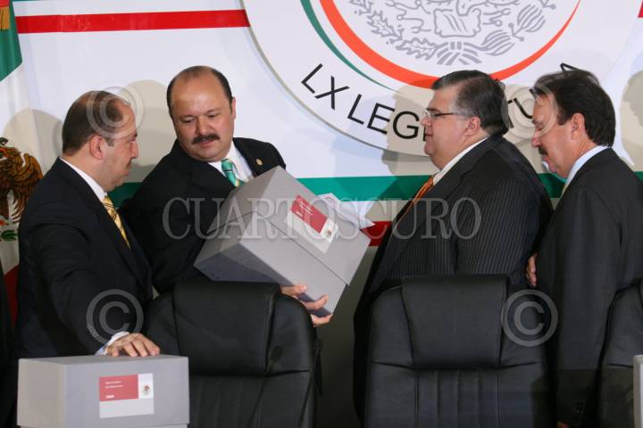MÉXICO D.F., 08SEPTIEMBRE2008.-Agustín Cartens Cartens, titular de la Secretaría de Hacienda y Crédito Público acudió este medio día a la Cámara de Diputados a entregar la propuesta del paquete Económico para 2009. En la imagen el diputado del PRI y presidente de la mesa directiva, Cesar Duarte Jáquez, recibe el Paquete , Económico 2009. FOTO: GUILLERMO PEREA/CUARTOSCURO.COM