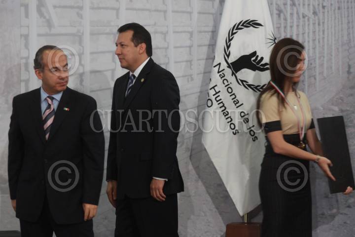 MÉXICO, D.F., 08DICIEMBRE2009.- Felipe Calderon Hinojosa Presidente de México,acompañado por el ombudsman Raul Plasencia Villanueva, entregaron una mención especial a Lorena Elizabeth Argueta Hernández, por su lucha a favor de víctimas de abuso sexual, durante la entrega del Premio Nacional de Derechos Humanos 2009 FOTO: SÁSHENKA GUTIÉRREZ/CUARTOSCURO.COM