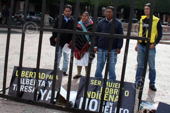 QUERÉTARO, QUERÉTARO, 22FEBRERO2010.- Los papas y el esposo de Alberta Teresa, (Mujer encarcelada por su presunta participación en un secuestro) y un grupo de integrantes de amnistía Internacional realizaron un performance y entregaron una carta para solicitar la liberación de las dos indígenas otomíes acusadas del secuestro de 6 elementos de la extinta AFI. Estas dos indígenas, junto con Jacinta Francisco Marcial fueron encarceladas en el CERESO de San José el Alto desde 2007. FOTO: DEMIAN CHÁVEZ/CUARTOSCURO.COM