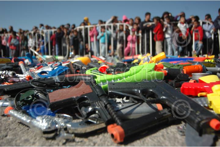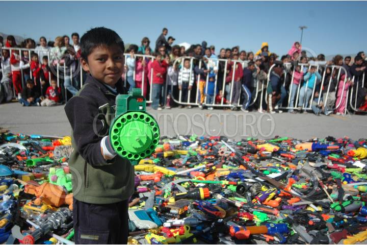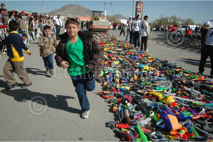 CIUDAD JUÁREZ, CHIHUAHUA, 28MARZO2010.- El día de ayer niños de diferentes edades entregaron armas bélicas de juguete las cuales fueron destruidas por las autoridades. FOTO: IGNACIO RUÍZ/CUARTOSCURO.COM